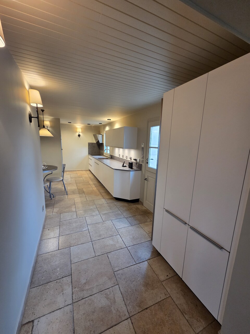 Aménagement d’une cuisine en longueur laqué, plan de travail en DEKTON