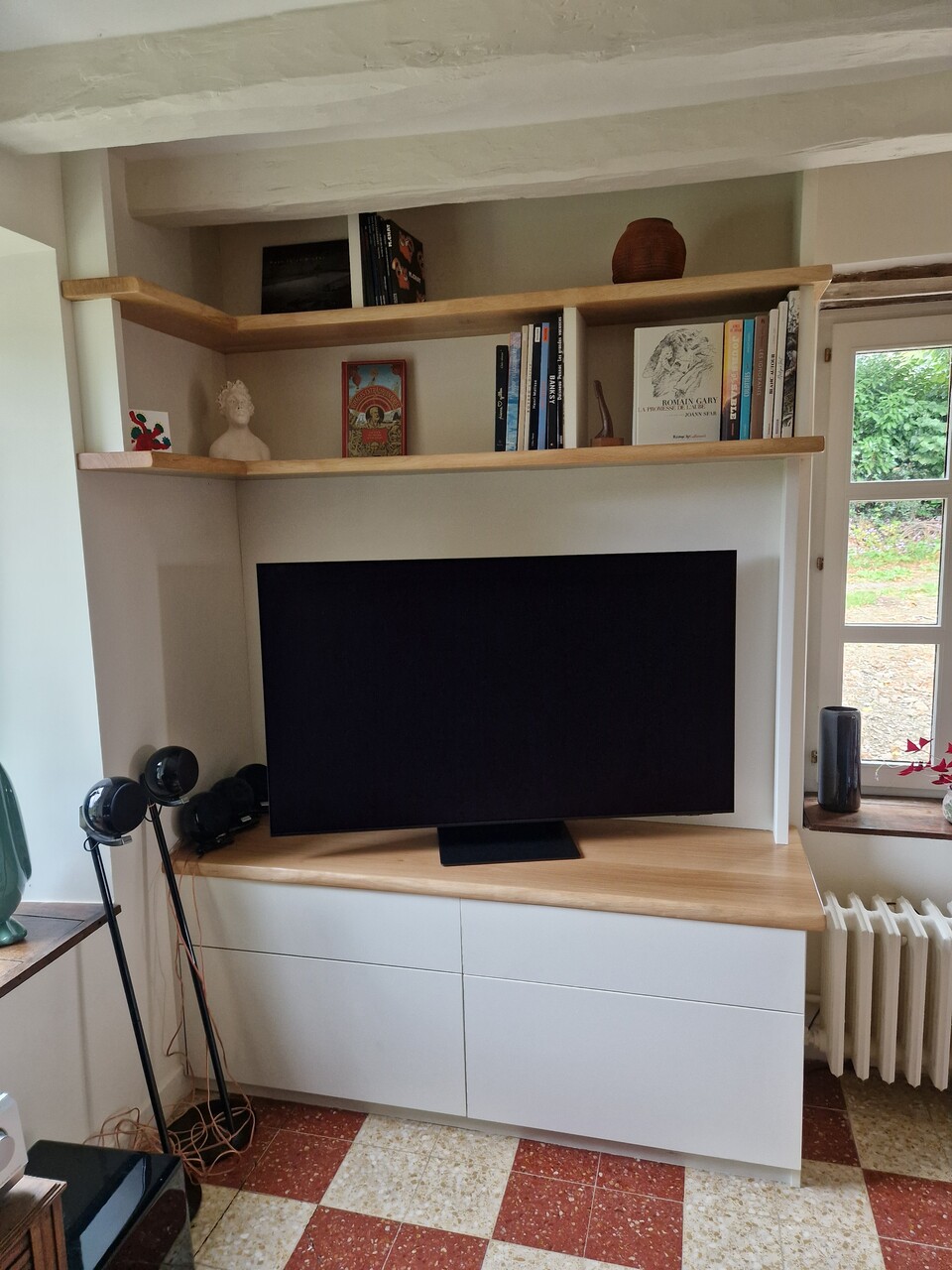 Meuble TV sur mesure avec tiroirs et tablette en chêne